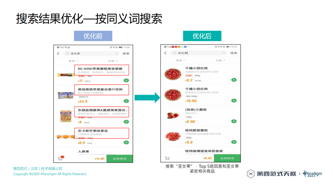 按同义词搜索,优化前搜索"圣女果",Top5返回了"果汁饮料"、"芒果味果冻"毫不相关的商品,优化后搜索"圣女果",Top5返回是和圣女果紧密相关商品。