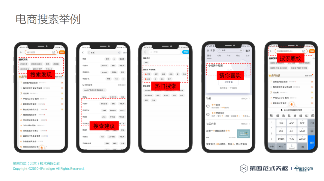 一般情况下,对于搜索,除了我们经常看到的去搜索框里面敲一些关键词来搜索以外,搜索还有其他场景,比如搜索发现、搜索建议、热门搜索、猜你喜欢和搜索底纹,其实这些已经不是单纯的搜索,而是跟推荐相结合的场景。