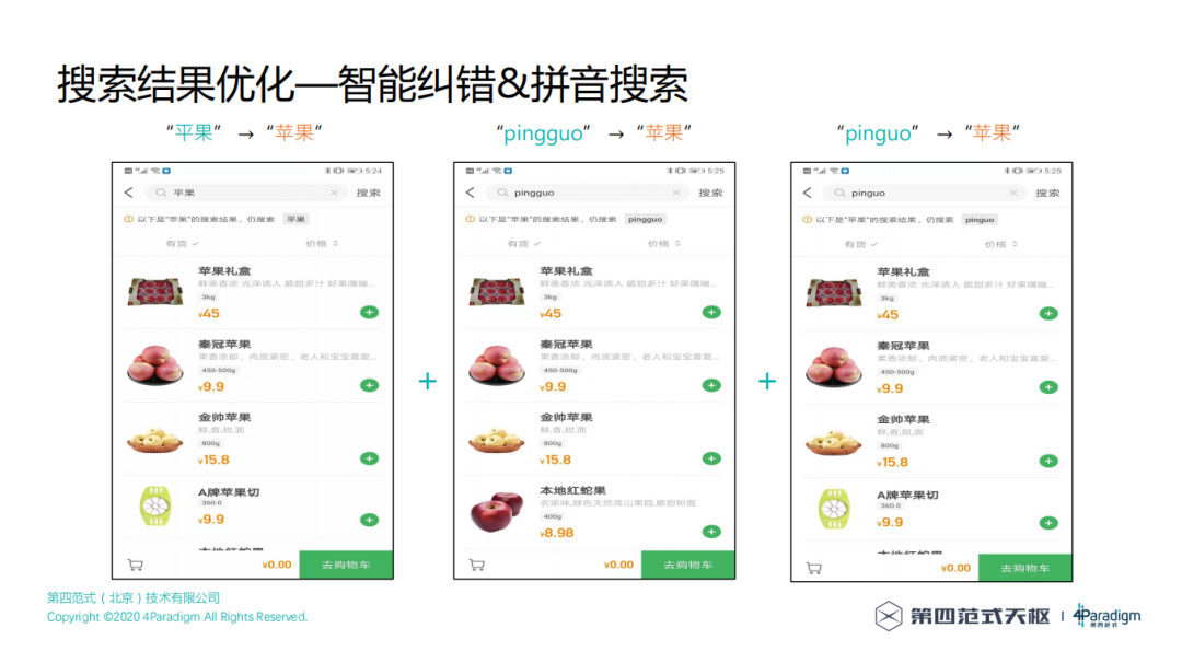 优化后,可以进行智能纠错和拼音搜索,比如搜索 "平果"、"pingguo" 和 "pinguo" 时,都能准确搜索出苹果相关的商品。