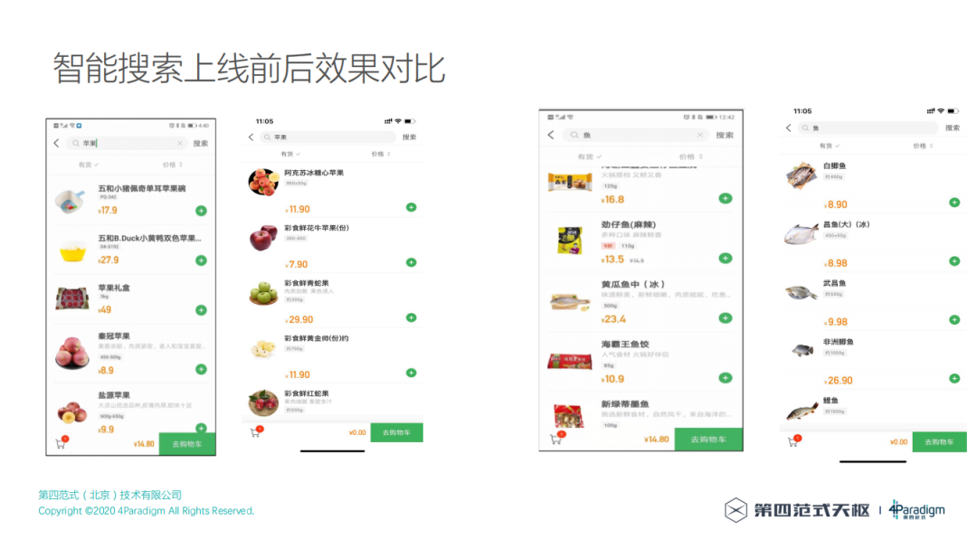 这是上线前后搜索结果的对比,没上线前搜索"苹果"时,排在前面并不是苹果,上线智能搜索之后,搜索结果都是"苹果"相关的。