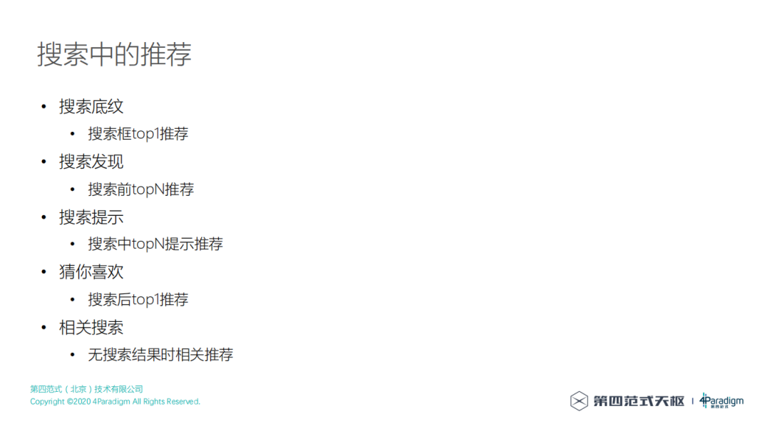 搜索底纹就是搜索框里面唯一的那个词,其实就是对搜索框top1的推荐,根据用户的历史行为,推荐出该用户最有可能搜的词汇取top1放在搜索底纹里,然后推荐给用户,用户看见这个底纹以后就有可能去搜这个底纹上的搜索词,目的是希望引导用户,猜出用户想要搜什么,提高转化率;搜索发现跟搜索底纹的原理差不多,只是有了更多推荐的搜索词;搜索提示是在搜索中做一些推荐,相关搜索是在没有搜索结果时做一些相关推荐;有的地方还会有猜你喜欢,猜你喜欢其实是一个纯推荐的场景,当用户打开搜索页面时,去猜用户最想要搜索的是什么,然后推荐给用户。这些其实都是搜索中的推荐,搜索中的流量和推荐中的流量是完全可以打通的。