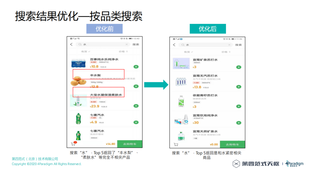 按品类搜索,优化前搜索"水",Top 5返回了"丰水梨"、"柔肤水"等完全不相关产品,优化后搜索"水",Top 5返回是和水紧密相关商品。