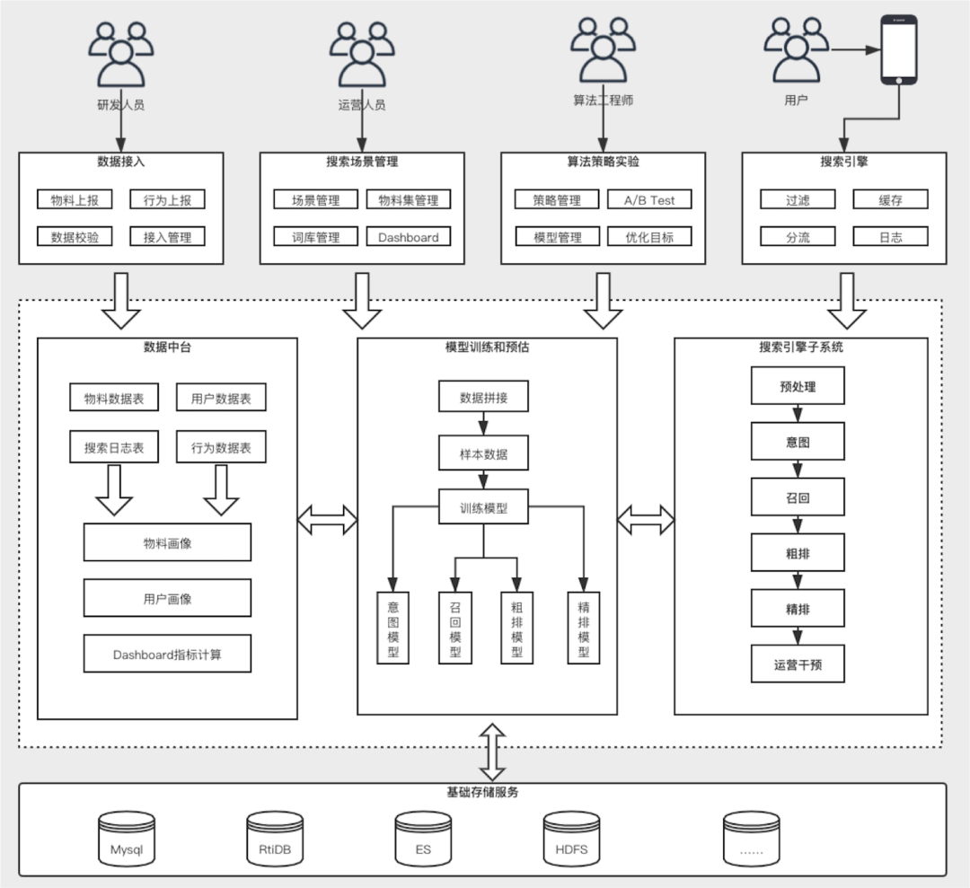 技术架构图主要分为三大块,一块是数据,一块是模型,一块是搜索引擎本身,其中数据和模型是为搜索引擎服务的,会有数据接入的一些模块,把客户的数据接入到系统里面,放入数据中台上去计算物料画像、用户画像等等;接下来,需要用这些数据建一些模型,这些模型会在搜索引擎的各个环节中用到,比如意图、召回、粗排、精排中各个环节都会用到;再往下,就是一些基础的数据存储中间件。我们主要围绕着搜索引擎本身这个流程展开,最右侧就是搜索引擎的流程,接下来我们从上往下来介绍一下整个搜索是如何做的。