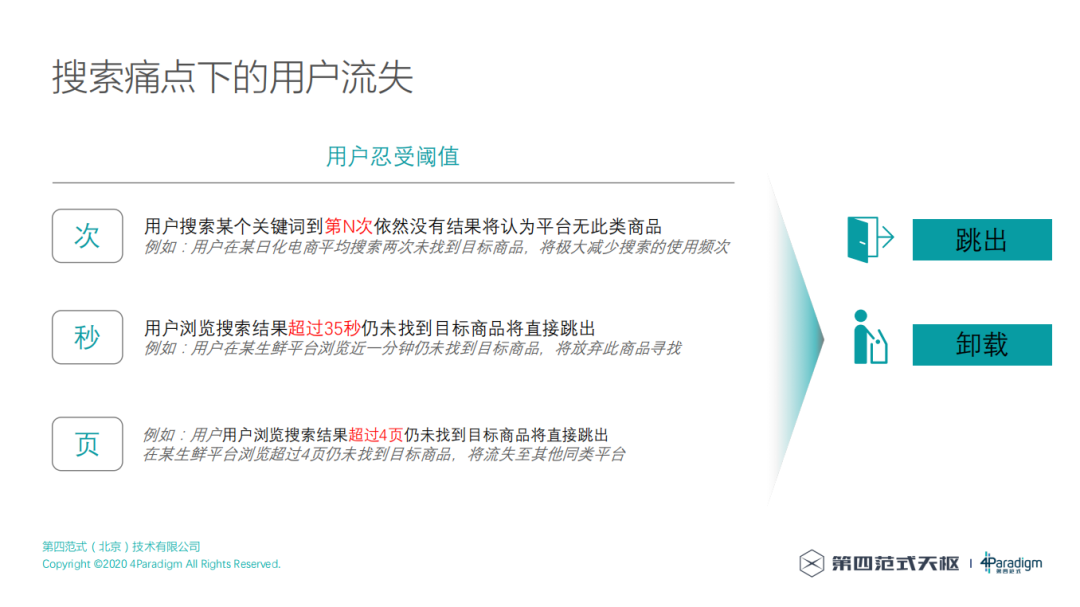 如果搜索做得不好,用户搜索多次,浏览搜索结果超过一定时间或者翻页几次以后,都找不到结果,就会因为无法忍受搜索体验而流失。