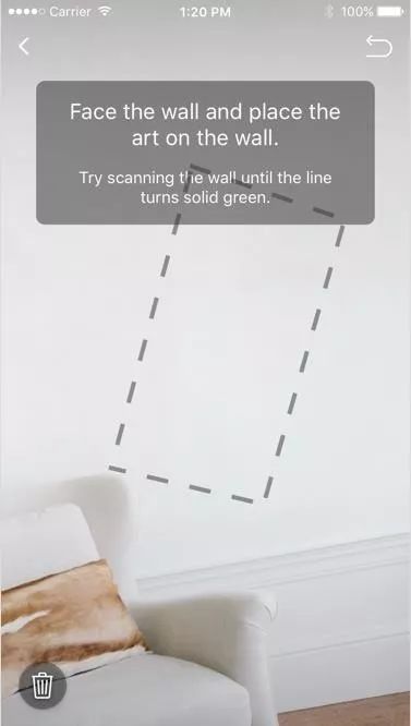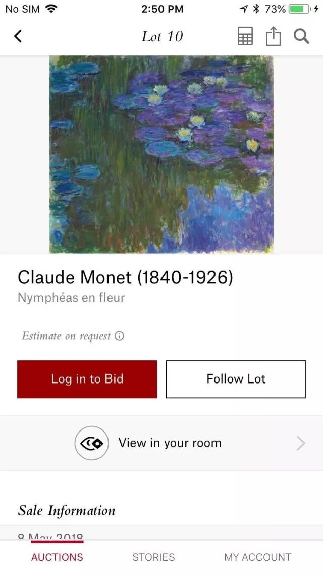 在应用程序的拍卖部分,选择标有AR图标的艺术品,然后将设备指向墙壁,就可以观看画作了。