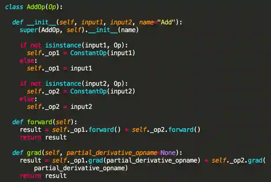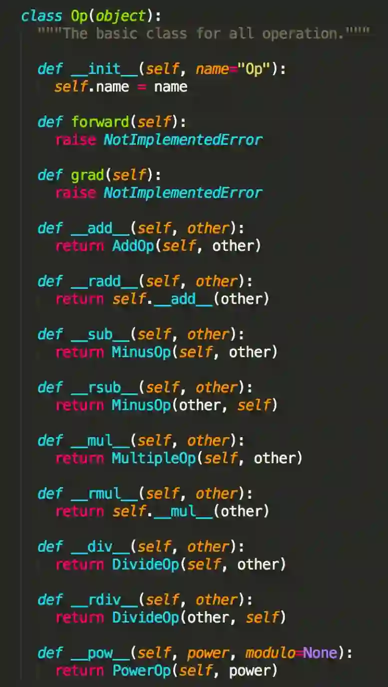 那么用户可以定义的最小操作,也就是 Op,需要平台实现基本的算子,例如 ConstantOp、AddOp、MultipleOp 等,而且用户实现自定义算子时可以加入自动求导的流程中,并不影响框架本身的训练流程。参考 TensorFlow 的 Python 源码,下面我们定义了 Op 的基类,所有的 Op 都应该实现 forward() 和 grad() 以便于模型训练时自动求导,而且通过重载 Python 操作符可以为开发者提供更便利的使用接口。