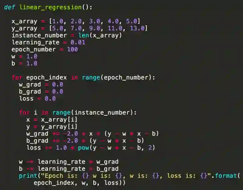 下面是一个最简单的线性回归 Python 实现,模型是简单的 y = w * x + b。