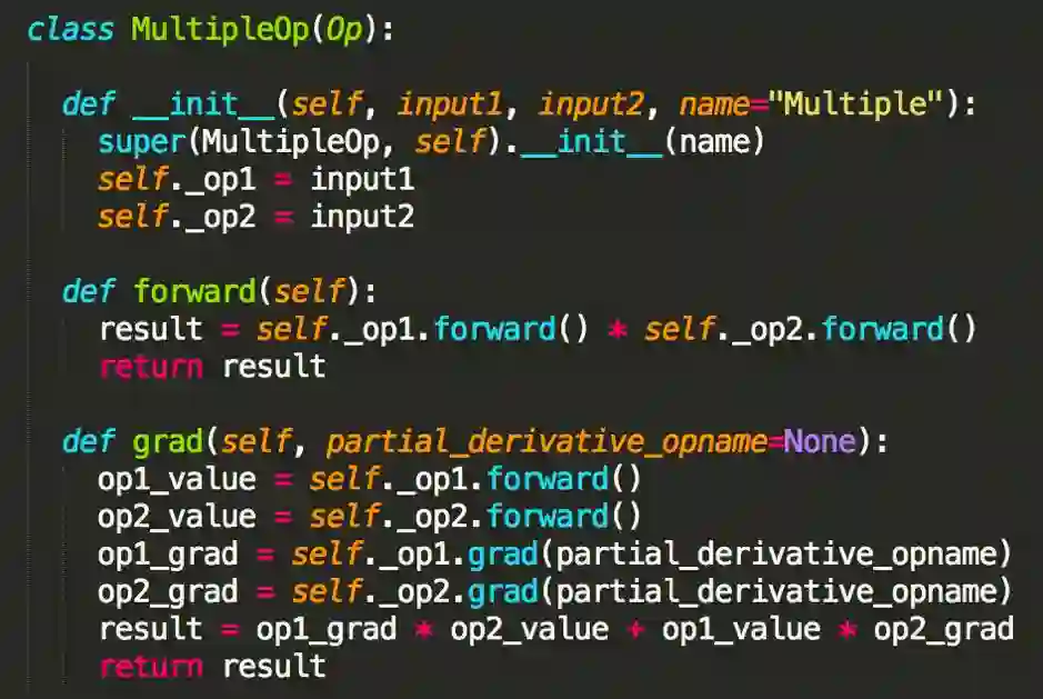 而乘法和除法相对复杂,显然两个数乘法的导数不等于导数的乘法,例如 x 和 x 的平方,先导数后相乘得到 2x,先相乘后导数得到 3 倍 x 的平方。因此这是需要使用乘数法则,基本公式是,而代码实现如下。