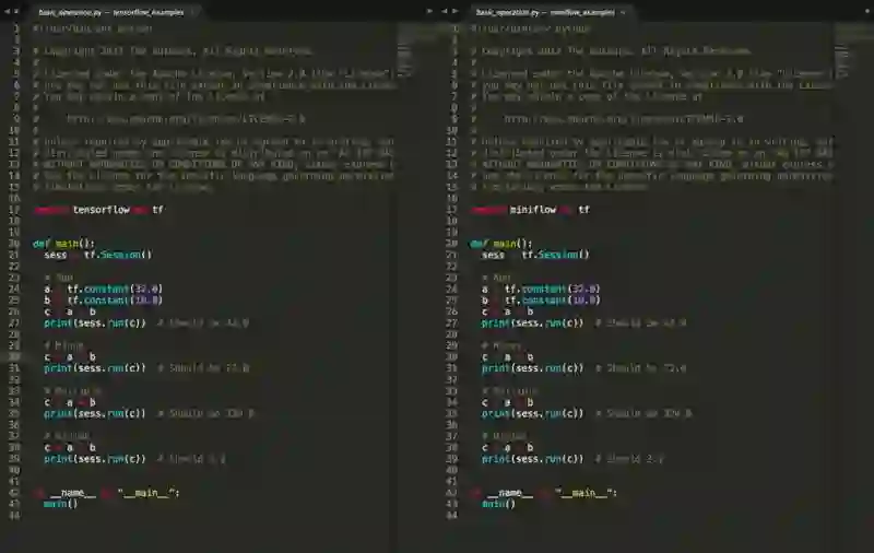 这个项目就是 MiniFlow,一个实现了链式法则、自动求导、支持命令式编程和声明式编程的数值计算库,并且兼容 TensorFlow Python API。感兴趣可以在这个地址参与开发 https://github.com/tobegit3hub/miniflow ,下面是两者 API 对比图。