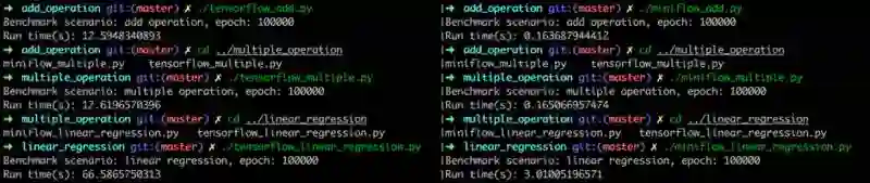 事实上,我个人在学习 TensorFlow 过程中,通过实现一个 TensorFlow-like 的项目,不仅惊叹与其源码和接口的设计精巧,也加深了对声明式编程、DAG 实现、自动求偏导、反向传播等概念的理解。甚至在 Benchmark 测试中发现,纯 Python 实现的项目在线性回归模型训练中比 TensorFlow 快 22 倍,当然这是在特定场景下压测得到的结果,主要原因是 TensorFlow 中存在 Python 与 C++ 跨语言的切换开销。