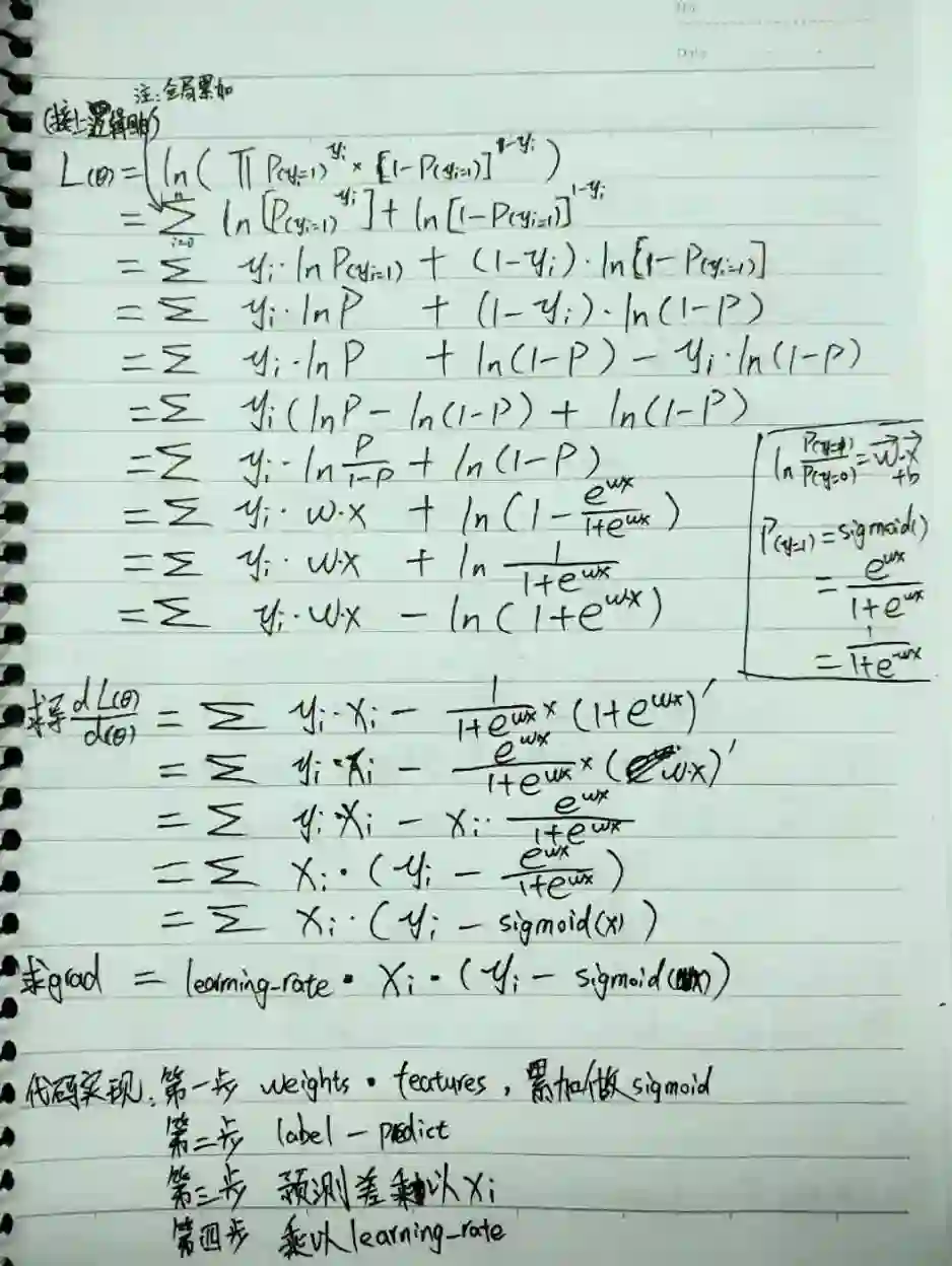 逻辑回归与线性回归类似,当由于是分类问题,因此需要对 w * x + b 的预测结果进行归一化(Normalization),一般使用 Sigmoid 方法,在 Python 中可以通过 1.0 / (1 + numpy.exp(-x)) 这种方式实现。由于预测值不同,Loss 函数的定义也不同,求偏导得到的数值计算公式也不同,感兴趣也可以看看我的公式推导。