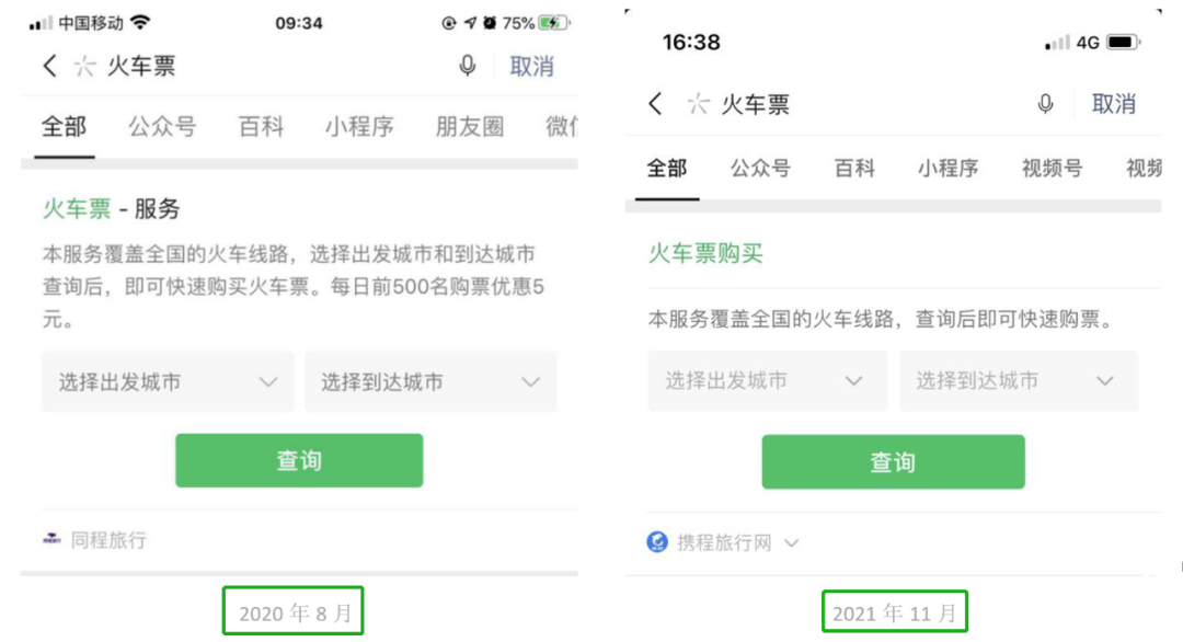 不过对用户来说,他们并不关心这些,他们只知道微信可以搜一搜买火车票了。我猜有相当比例的群众根本没有注意到这项服务的提供商从同程旅行切换到了携程旅行网。