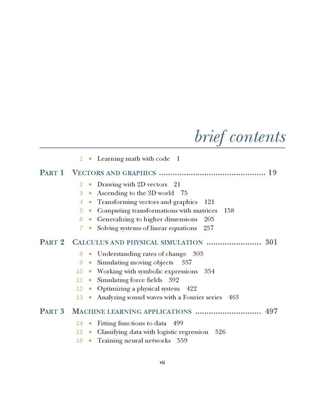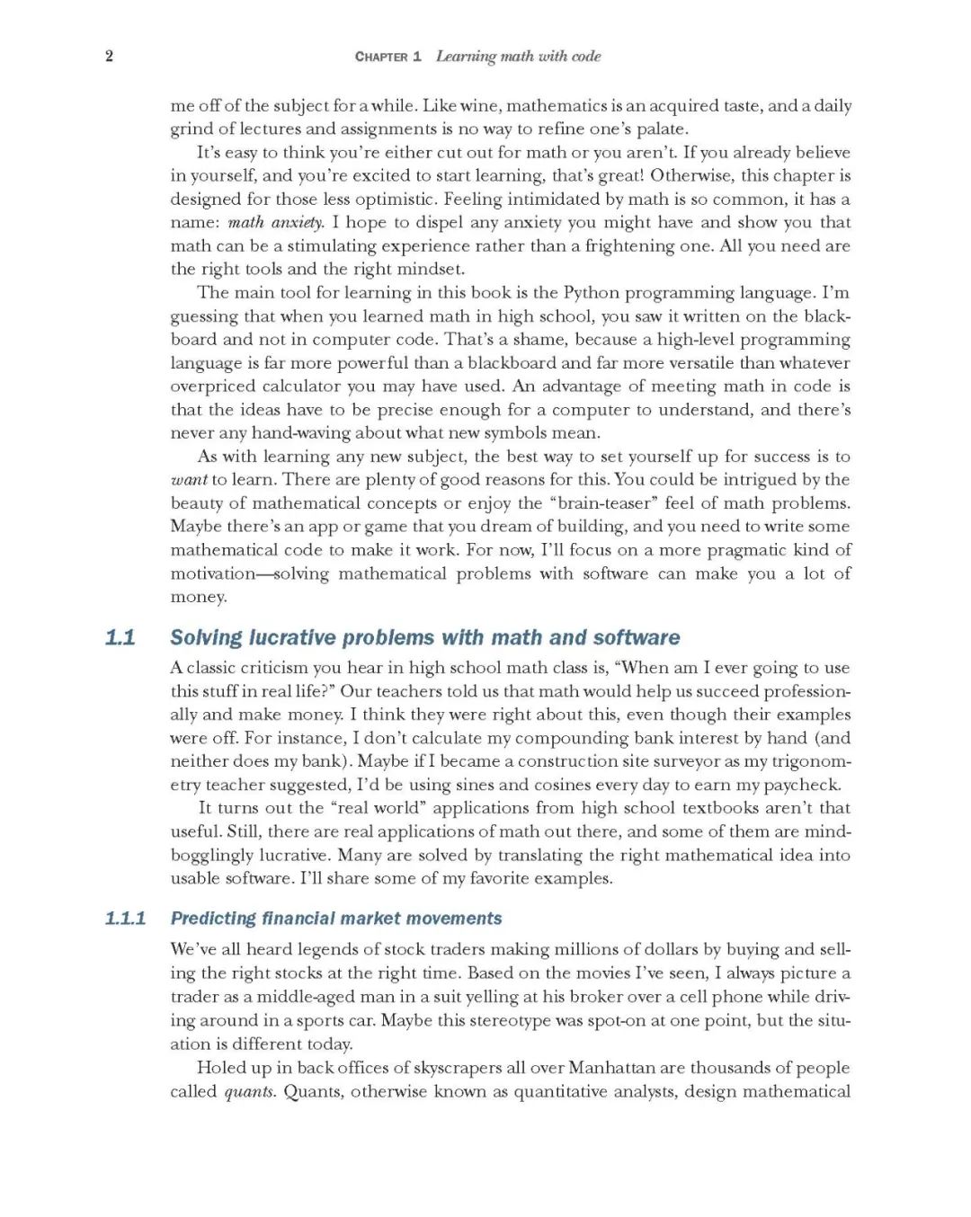 数学在其他现代应用中也扮演着不可或缺的角色,如游戏开发,计算机图形和动画,图像和信号处理,定价引擎和股票市场分析。无论你是一个没有核心大学数学基础的自学成才的程序员,还是你只需要重新点燃数学余烬,这本书就是激发你技能的好方法。