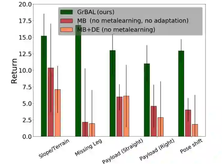 通过有效地在线适应,在少了一条腿走直线的实验中,BAIR的方法阻止了漂移,阻止了滑下斜坡,解释了位姿错误校准,以及调整到牵引有效载荷。值得注意的是,这些任务/环境和在元训练阶段学习的运动行为有足够的共性,从先前的知识(不是从零开始学习)中提取信息是有用的,但是他们的差异很大,需要有效的在线适应才能成功。