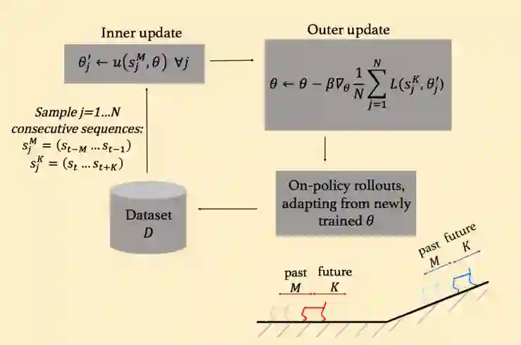 在训练时间里(图四),这个总和是选择一个连续的(M+K)数据点的序列,使用第一个M来更新模型权重,从θ到 θ′,然后优化新的 θ′, 让它擅长为下一个K时间步预测状态转换。在利用过去K点的信息调整权重后,这个新表述的损失函数代表未来K点的预测误差。