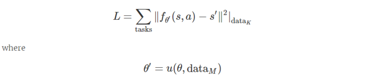 换句话说, θ不需要导致好的动态预测。相反,它需要能够使用具体任务的数据点,将自身快速适应到新的权重中去,依靠这个新的权重得到好的动态预测结果。有关此公式的更多直观信息,可参阅MAML blog post: