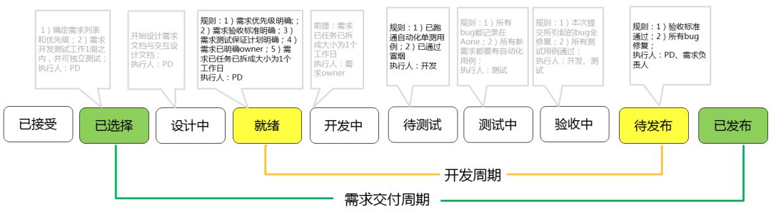 研发流程并非一成不变,应该是一个不断演进调整的过程。规则调整由团队共同商议决定,尤其对于就绪、待测试、待发布几个关键状态的规则定义显得尤为重要,这是因为就绪规则是要控住入口,明确需求是否合理拆分;待测试规则是为了确定提测前是否做过自测,以保证不要一上去就把测试环境给弄趴下了;待发布是要保证发布质量。