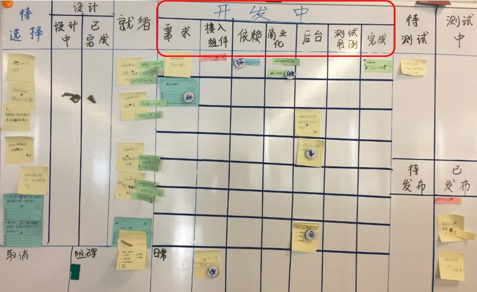 初期的可视化板,主要是展现出团队当前迭代要做的工作以及每天出现的问题。过程中对物理板的规则并未做太多约束,主要起到可视化的作用。这样一方面降低了可视化工作的门槛,让大家愿意使用,另一方面,能把大家最真实的工作状况给反映出来,如下图所示: