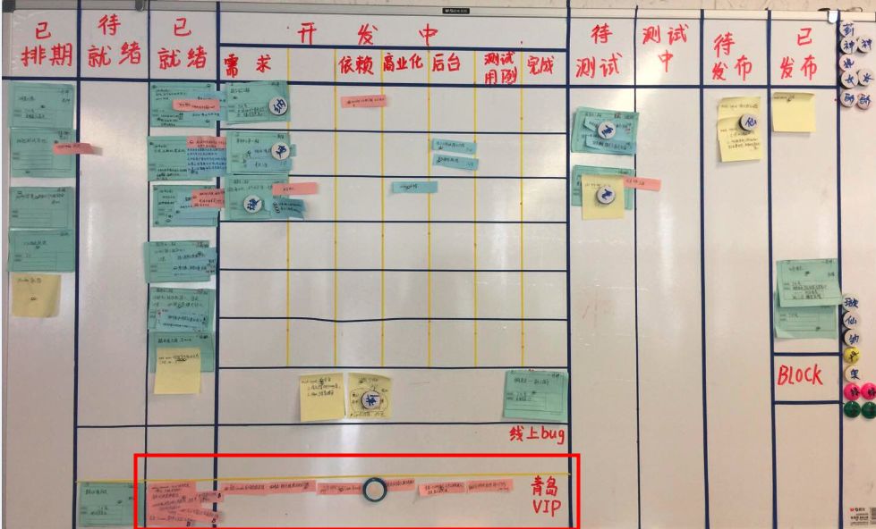 我们发现,环境的问题并不是技术上不可行,而是在研发过程中,环境修复缺少足够的优先级,不能得到足够的投入。当环境问题已经影响到持续测试后,我们在看板中设一个泳道(下图中的青岛 VIP),由测试同学把当前测试环境中的问题在这个泳道展现出来,并作为最高优先级由研发同学来修复。并且在站会时,首先去关注环境是否可用。