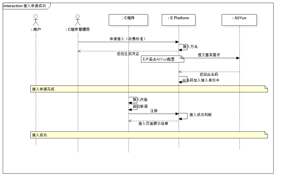 需求背景:某组件需要接入到 E 产品, 以按量计费的形式提供服务,并通过阿里云统一按流量收费;组件接入到 E 产品后,用户通过访问产品页面开通 / 暂停 / 使用组件