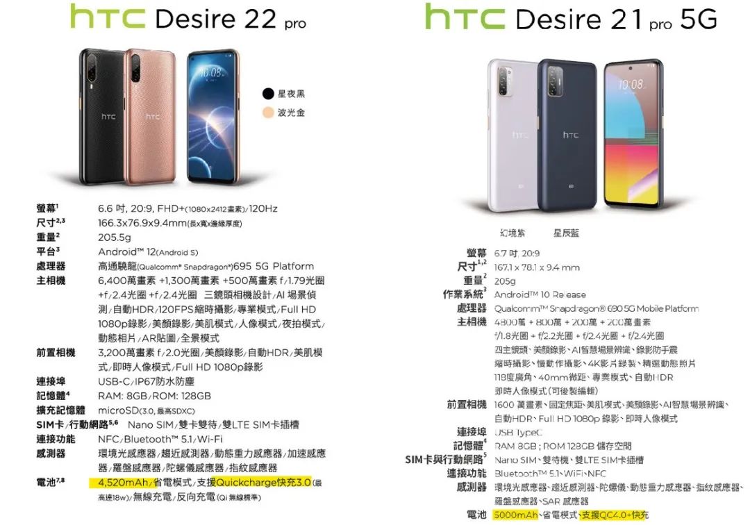 如果我们再对比一下上一代的 HTC Desire 21 pro,那么我们就会发现,新机主要也就提升了高刷(90Hz 变 120Hz)和相机规格,其他升级并不多,甚至在电池容量(5000mAh 变 4520mAh)、快充规格(QC 4.0 变 3.0)等“感知不强”的地方开了倒车。