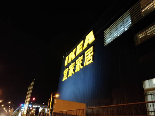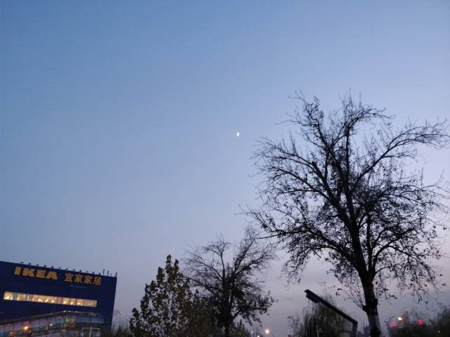 这张照片拍摄于光线还算充足的傍晚,左下角宜家的建筑主体仍旧能保留足够的暗部细节。整体的色调非常舒服,天空也没有明显的噪点痕迹。没有手动点按具体的对焦点,远方的月亮隐约可见,寒冬枯树仿佛有一种魔幻现实主义感。
