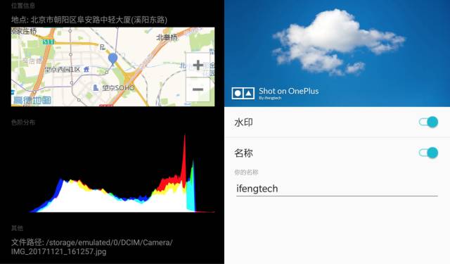 一加5T的专业模式和相机水印都很有特点,专业模式可以实时显示色阶分布,「Shont on OnePluls」水印下可以添加自己的ID。