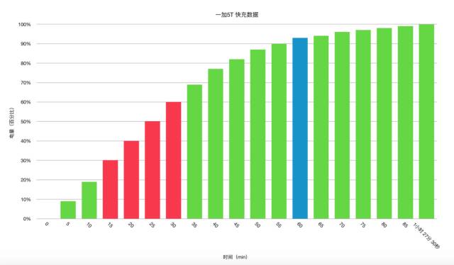 使用原装充电头和数据线,一加5T完全充满耗时1小时27分30秒。在10-35分钟这段时间内,是快充效率最高的时间段,手机电量基本保持「每5min增加10%」的速度。充满一半仅耗时25分钟,一个小时可以充超过90%的电量。