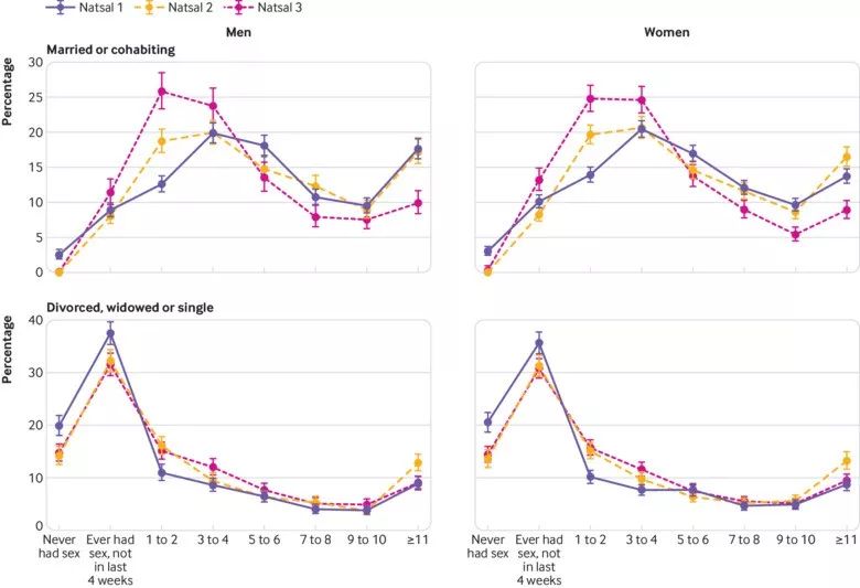研究还发现,单身人群并没有出现这种程度的下降,这表明英国整体性行为频率降低的趋势主要是由于已婚或同居伴侣性生活减少导致的。