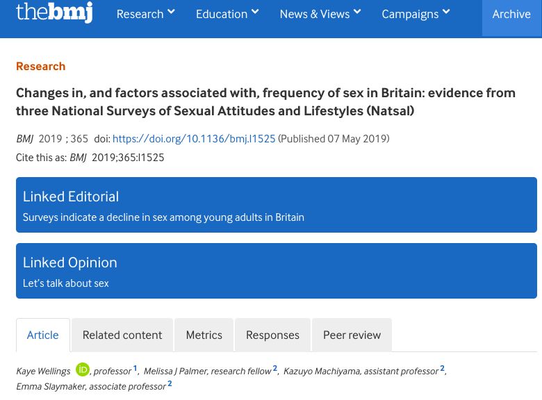 论文作者认为,如果性行为频率的降低发生在更广泛的层面,可能更加令人担忧。他们总结道:“如果性行为活跃度被当做能够指示人类关系的晴雨表,那么它的降低可能被视为一种令人不安的趋势。我们观察到的这一现象很有意思,但它还没得到充分的解释,并需要进一步探索。”