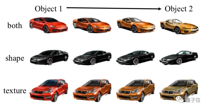 对相同类型、相同视角的物体,如果给出两种不同形状、材质的图片,它还能从中“线性插入”图片,有下图中渐变的效果: