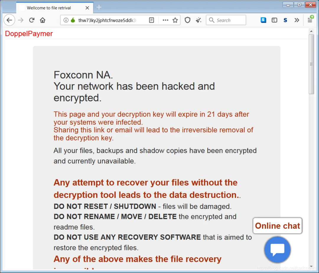 近日, DoppelPaymer 勒索软件在其勒索软件数据泄漏站点上发布了属于富士康的文件。泄漏的数据包括常规业务文档和报告,但不包含任何财务信息或员工的个人详细信息。
