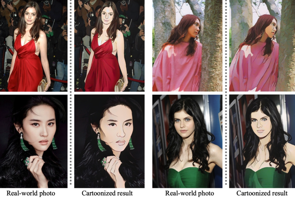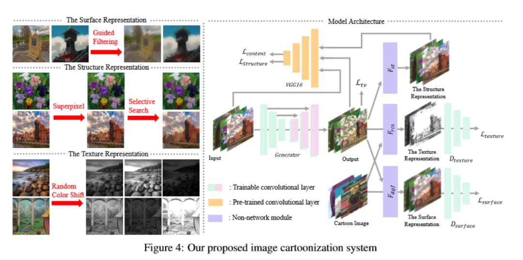 本文提出了一种将图像卡通化的方法。通过观察卡通绘画行为并咨询卡通艺术家,本文提出可以从图像中分别识别三个白盒表示:一是卡通图像平滑表面的轮廓表示,二是针对稀疏色块和全局内容的结构表示,三是在卡通图像中反映高频纹理,轮廓和细节的纹理表示。作者利用生成对抗网络(GAN)框架来学习提取的表示并将图像卡通化。
