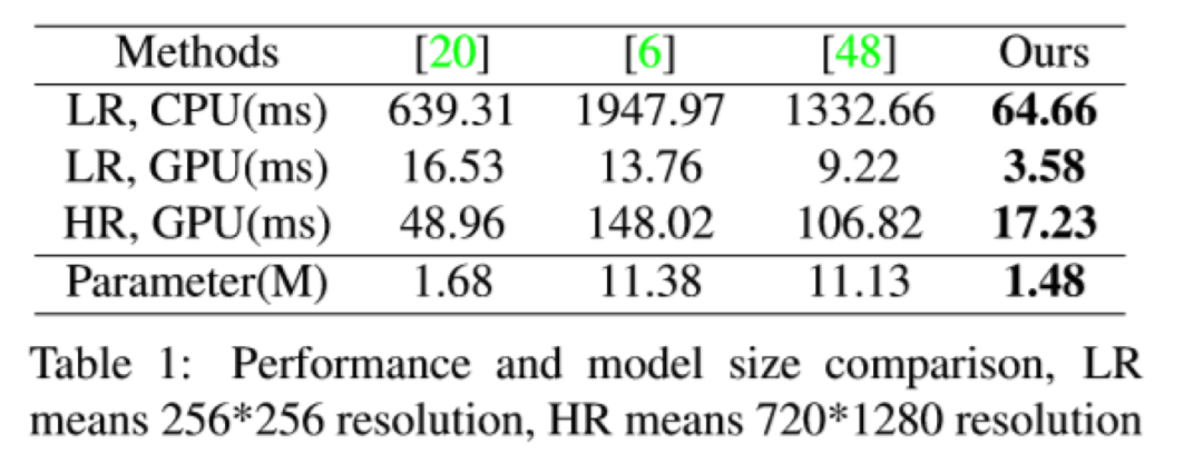 本文算法是基于tensorflow实现的,代码已开源。训练的超参基本都是常规的训练参数,而loss权重的超参是基于对训练集的统计确定的。作者对模型的性能和效果均做了分析,效果如下,本文算法在对比的算法中,是最高效的。