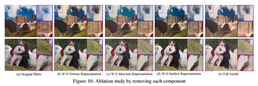 图10是显示消融实验中,每个特征表示的结果。图8展示了本文算法的可调控性。结果显示可以通过在损失函数中调整每个特征表征的权重来调整卡通化结果的样式。
