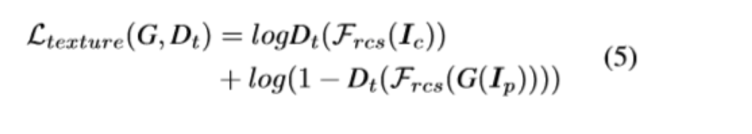 作者定义了一个网络F_dgf,以图片I为输入,并以它自己为guide map,输出提取的去掉纹理和细节的外观特征F(I,I)。同时定义了一个判别器D_s,用以判断真实图和卡通图的输出分布是否一致。损失函数就是经典的gan的损失函数,如下,其中Ic为输入的卡通图,Ip为真实图。