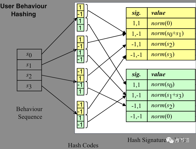 所示,聚合方法就是先按位相加,再做L2-normalization。这样,就把user behavior sequence存储成若干buckets。