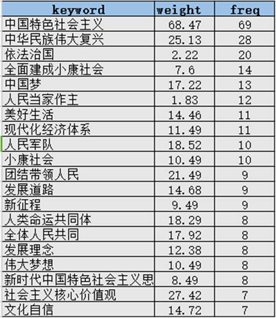 分析结果显示,词频统计top10的关键词分别为:“中国特色社会主义”、“中华民族伟大复兴”、“依法治国”、“全面建成小康社会”、“中国梦”、“人民当家作主”、“美好生活”、“现代化经济体系”、“人民军队”、“小康社会”。这些高频词汇基本概括了十九大报告中的基础概念。