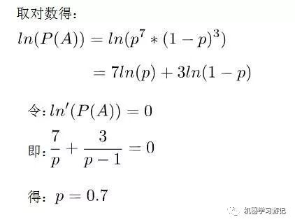 我们假设7次黑球,3次红球为事件 A ,一个理所当然的想法就是既然事件 A已经发生了,那么事件 A 发生的概率应该最大。所以既然事件 A 的结果已定, 我们就有理由相信这不是一个偶然发生的事件,这个已发生的事件肯定一定程度上反映了黑球在整体中的比例。所以我们要让模型产生这个整体事件的概率最大,我们把这十次抽取看成一个整体事件 A ,很明显事件 A 发生的概率是每个子事件概率之积。我们把 P(A) 看成一个关于 p 的函数,求 P(A) 取最大值时的 p ,这就是极大似然估计的思想。具体公式化描述为P(A)=p^7*(1-p)^3。