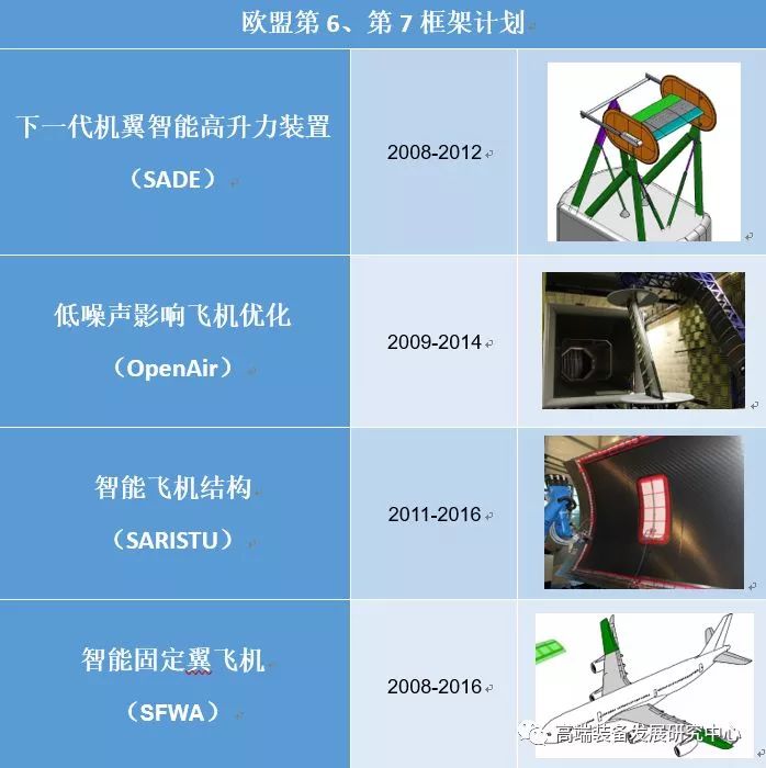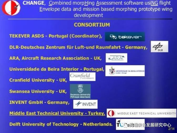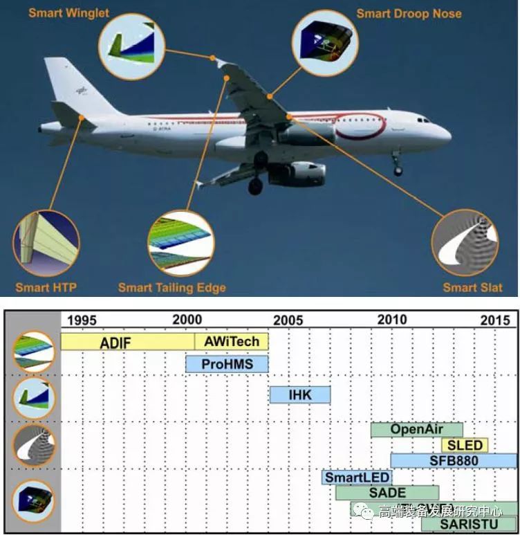 欧盟进行变形机翼研究的主要机构是德国航空航天中心(DLR)的复合材料和自适应系统研究所,该所从1995年对变形机翼结构就开展了研究。此后,DLR通过内部自投资、德国航空研究计划(Luftfahrtforschungsprogramm,LuFo)、欧盟框架计划持续对变形机翼的结构进行研究,这一系列研究涵盖智能机翼后缘、智能小翼、智能前缘、智能前缘缝翼等相关应用场景。