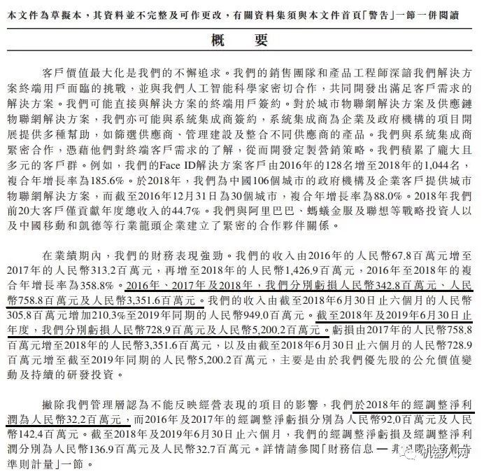 根据招股书披露,2019年上半年,旷视科技营收为9.49亿元,同比增长210.3%,经调整净利润为3270万元,2018年同期经调整净亏损为1.369亿元,此外,旷视科技在2016年、2017年、2018年的营收分别为6780万元、3.132亿元、14.269亿元,年复合增长率为358.8%。