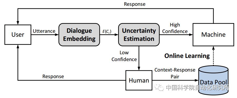 该框架可以度量当前系统回复的不确定性程度。当系统有较高置信度时,机器给出回复;反之,由人工介入对话过程。同时,人工介入所产生的数据会反馈到模型中扩展系统的候选回复集合并优化模型参数,使得系统上线后还能不断地学习以适应未考虑到的情形。