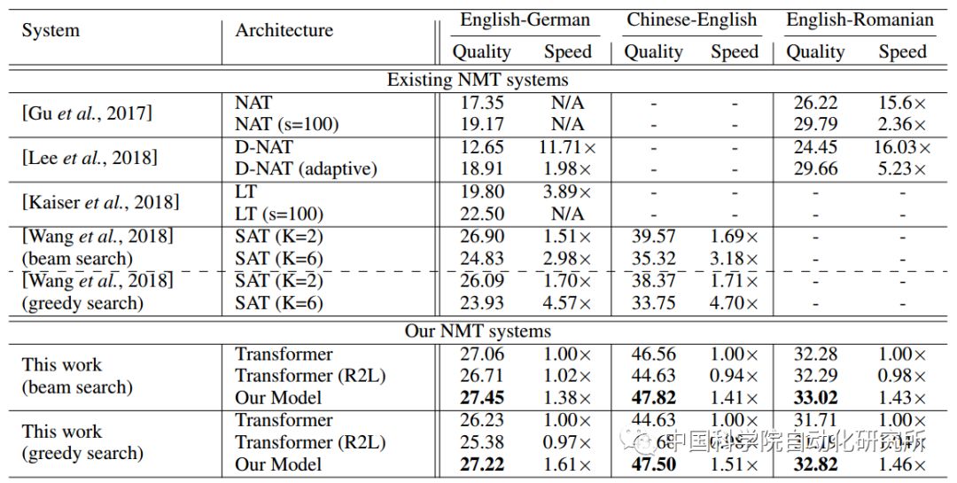 自动化所提出的同步双向序列生成模型(SBSG)采用了从目标序列的两端往中间的生成方式,每个时刻可以生成两个单词,相对于传统序列生成模型而言,理论上可以减少近一半的解码时间。其次,SBSG模型使用了一个交互双向注意力网络来实现从左到右解码(L2R)和从右到左解码(R2L)之间信息的相互利用,即一种解码模式可以利用另一种解码模式生成的序列来指导当前的解码。不同于生成质量出现显著下降的非自回归模型,SBSG模型相比于当前最优的自回归的Transformer模型在序列产生质量和解码速度上都得到了显著提升。