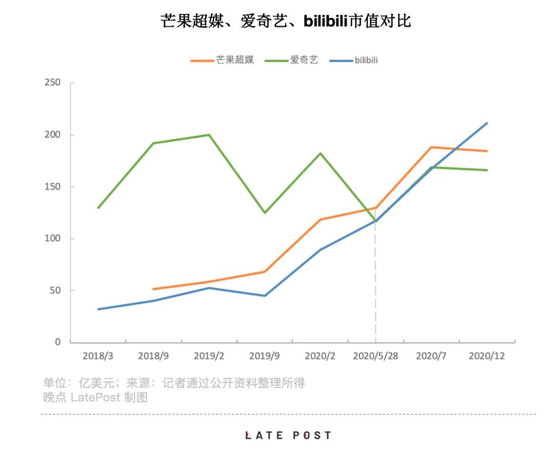 截止发稿,芒果超媒市值 1222 亿人民币(185 亿美元),超过爱奇艺的 164 亿美元。