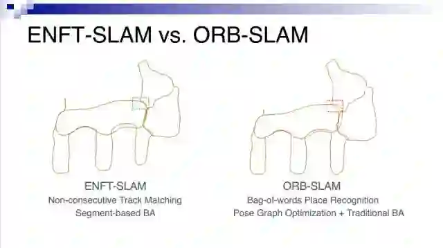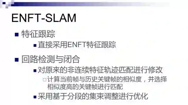 特征跟踪直接采用ENFT特征跟踪,主要在回路检测与闭合上做了改进,分为两部分:对原来的非连续特征轨迹匹配进行了修改,通过计算当前帧与历史关键帧的相似度并选择相似度高的关键帧进行匹配。全局优化的时候还是采用基于分段的集束调整进行优化。