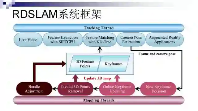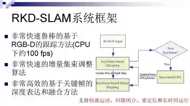 这个工作跟前面一个RKSLAM的工作比起来,最主要的突破是将深度信息加入跟踪,并用来做稠密的三维重建。右边是RKD-SLAM的系统框架,主要有三个贡献: