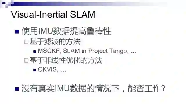 Visual-Inertial SLAM方法广泛应用于机器人领域,这类方法使用IMU数据来提高鲁棒性。但是,在没有真实IMU数据的情况下,能否借鉴一些Visual-Inertial的方法来将SLAM做得更好呢?