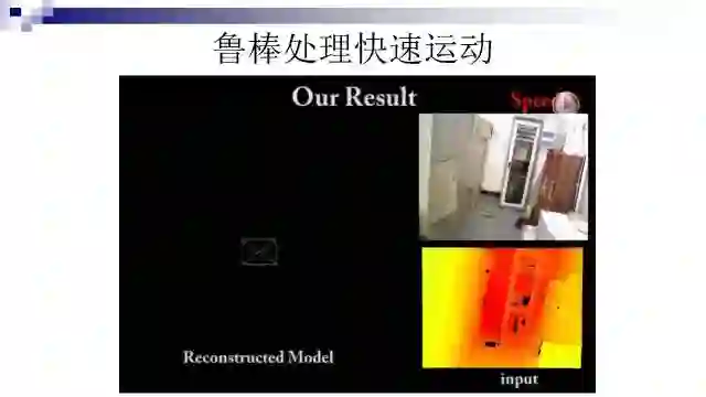 我们可以鲁棒地处理相机快速运动。这个例子是每秒30帧录的,但实际运行的时候是每隔三帧取一帧,所以相当于以每秒10帧的速度录的。可以看到,我们的方法能够鲁棒地跟踪和重建,而ElasticFusion和Kintinuous跟踪和重建的结果都不理想。