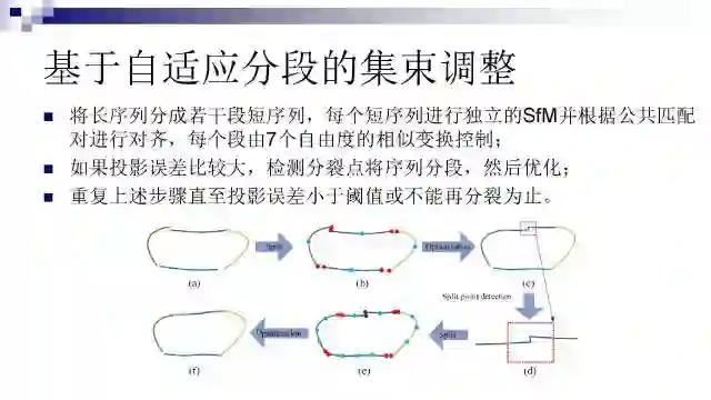 将长序列分成若干段短序列,每个短序列进行独立的SfM求解,并根据公共匹配对进行对齐,每个段由7个自由度的相似变换控制;