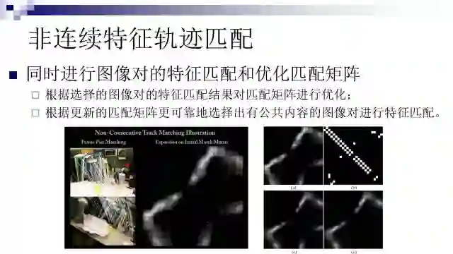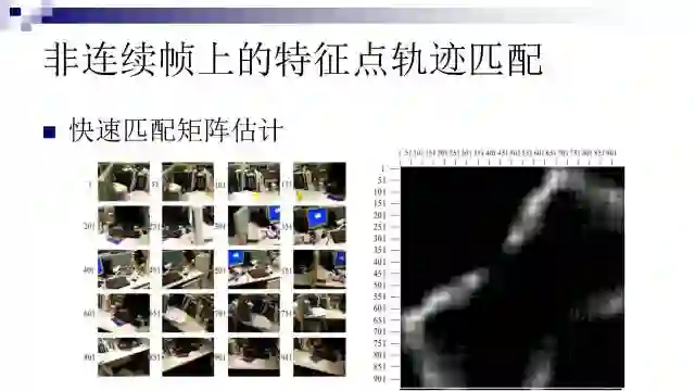 要做非连续帧的特征轨迹匹配,首先需要知道哪两帧之间有共同内容,否则采用暴力匹配,计算复杂度非常高。这部分可以用一些类似bag of words 的方法快速估计匹配矩阵,匹配矩阵的横纵坐标值代表帧号,矩阵元素的数值代表某两帧之间的可能匹配点的数量。